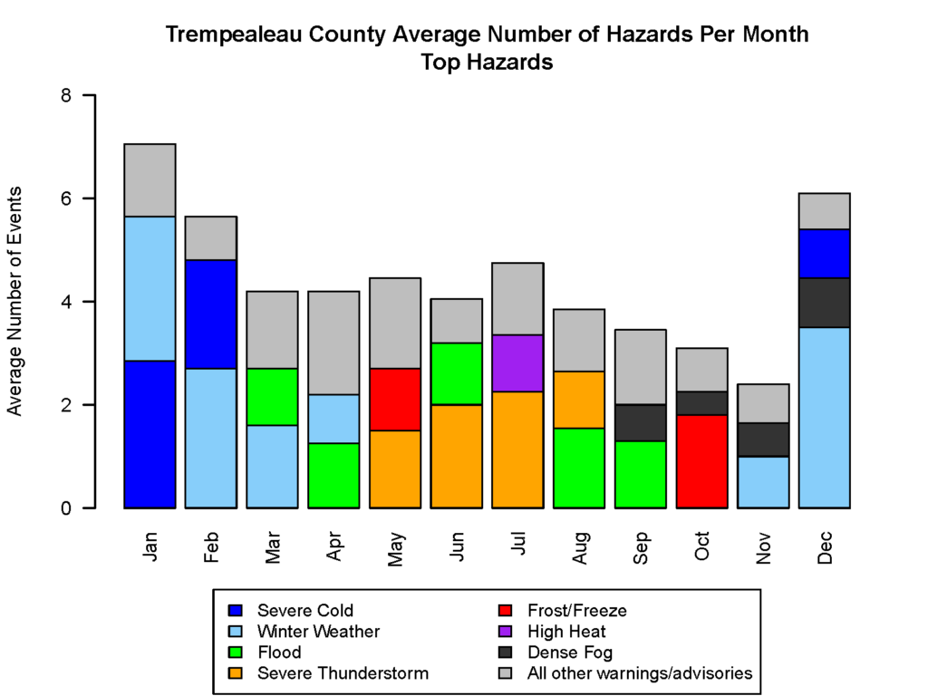 Trempealeau County deals with an array of hazardous weather throughout the year, and the type of hazards vary from season to season. The bar chart and table above are summaries of warnings and advisories issued by the National Weather Service for Trempealeau County over the past 21 years (2005-2025). Looking at hazards by month/season, the winter months are characterized by severe cold, snow events, and dense fog. Severe thunderstorms and flooding are more common in the late spring to early fall. Frost advisories and freeze warnings are most common in May and October as these are the times of year when we are transitioning into or out of the growing season and plants are susceptible to frost. Overall, the most common hazards in a year in Trempealeau County are winter weather, floods, and severe thunderstorms. Tornadoes are more uncommon, with one tornado warning issued every two years for the county, on average.