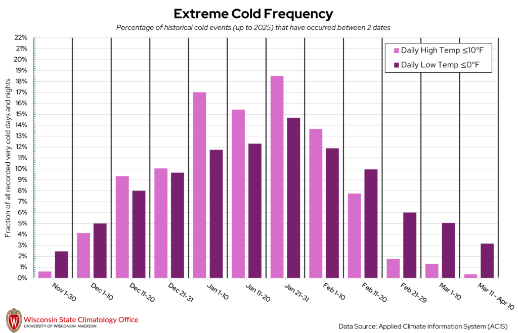 Trempealeau County can get quite chilly once winter rolls around! Some of our coldest days of the year in Wisconsin are when the overnight low temperatures dip below 0°F. The State Climatology Office performed an analysis on the likelihood of a “very cold day” (daily high temperature ≤ 10°F) or “very cold night” (daily low temperature ≤ 0°F) occurring between two calendar dates using historical measured temperature data from NOAA stations in Trempealeau County. Based on this analysis, very cold days and nights have occurred most frequently between January 21 to 31. Over the past 20 years (2006-2025), Trempealeau County experienced, on average, eight very cold days per year and 26 very cold nights per year.