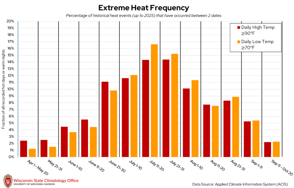 Trempealeau County is no stranger to sweltering summer heat, where daytime temperatures can top 90°F or even 100°F. But when are these hot days most likely to occur in Trempealeau County? The State Climatology Office analyzed the likelihood of a “hot day” (daily high temperature ≥ 90°F) or “warm night” (daily low temperature ≥ 70°F) occurring between two calendar dates using historical measured temperature data from NOAA stations in Trempealeau County. Based on this analysis, hot days have occurred most frequently between July 11 to 31. Warm nights have occurred most frequently from July 11 to 20. Over the past 20 years (2006-2025), Trempealeau County experienced, on average, 10 hot days per year and 13 warm nights per year.