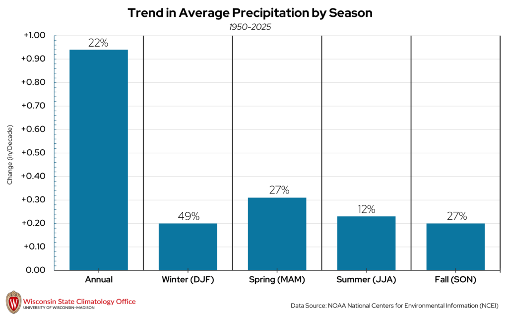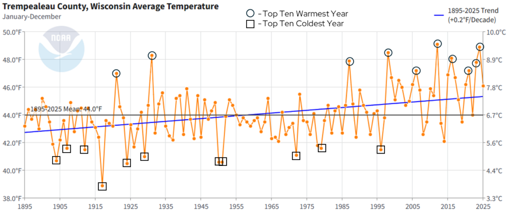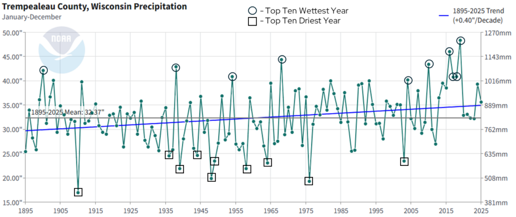 Annual precipitation shows a lot of year-to-year variability, which is normal within a long-term trend. However, there are two notable trends that come from this dataset. First, precipitation is increasing at a rate of 0.40 inches per decade from 1895 to 2025. That’s an increase of one inch approximately every 25 years. Second, if we look at the top ten wettest years since 1895 (black circles), six have occurred since 2000. By contrast, of the top ten driest years (black squares), nine occurred prior to 2000. These trends are quite similar to what has been observed in Trempealeau County with temperatures since 1895.
