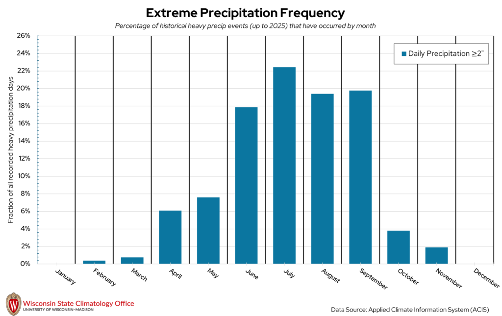Heavy precipitation days, which for this publication refers to a one-day liquid precipitation total of two inches or more, can impact Trempealeau County at all times of the year. Extreme precipitation in the winter is measured by the amount of liquid that would be present if you melted down all of the snow that fell that day. The vast majority of these heavy precipitation days (80 percent) have occurred from June through September. July is the month that has historically had the most heavy precipitation days in Trempealeau County. In general, summer is the wettest season in Trempealeau County, with winter being the driest season. Over the past 20 years (2006-2025), Trempealeau County experienced, on average, 13 heavy precipitation days per decade.