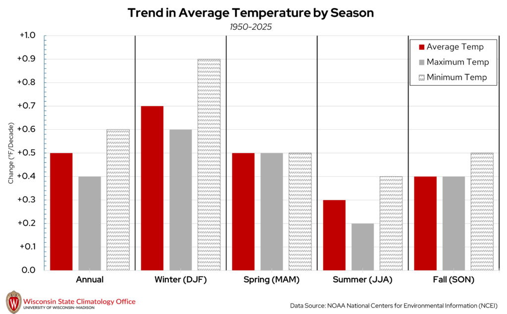 Temperatures have been increasing since 1950 in Trempealeau County on the annual and seasonal time scales, which is the case for most of Wisconsin. Since 1950, annual average temperatures in Trempealeau County have increased at a rate of 0.5°F/decade, which translates to an increase of 1°F every 20 years. This increase in temperature has been most pronounced in the winter months and less pronounced in the summer months. When average temperatures are split into daily high and low temperatures, low temperatures have been warming at a faster rate compared to high temperatures.