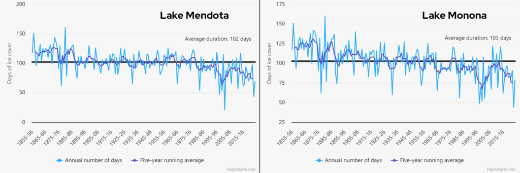 As winters have gotten warmer in Wisconsin, there has been a reduction in lake ice coverage and duration. Recent research finds that as our temperatures are projected to increase in the future, the number of lakes in the northern hemisphere experiencing intermittent ice cover will greatly increase. Long-term data at Lakes Mendota and Monona indicate a declining trend in annual ice coverage duration. Likewise, on the Great Lakes, there has been a declining trend in annual lake ice coverage since the 1970s. Longer periods of open water on the Great Lakes can be expected to lead to an increase in lake-effect precipitation.