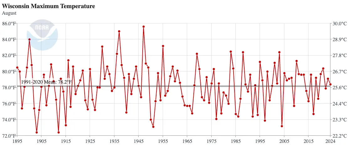 The coolest August occurred in 1915, with a statewide average temperature of just 61 degrees. Late in the month that year, many cities in the Northwoods reported that overnight temperatures fell below freezing — some even reached the mid-20s! Wausau reached 32 degrees on August 30 of that year, marking the earliest the city had ever dipped below freezing.