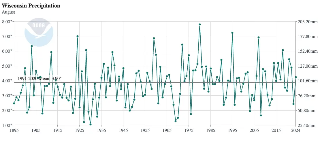 The driest August on record in Wisconsin was in 1930, during the beginning of the Dust Bowl, when the statewide average was barely over an inch — 1.06 inches to be exact! The northwestern region of the state was the driest, with areas near Ashland reporting a tenth of an inch of rain for the entire month. Lake Mills in Jefferson County reported the highest amount of rain in August that year, reaching just over three inches.