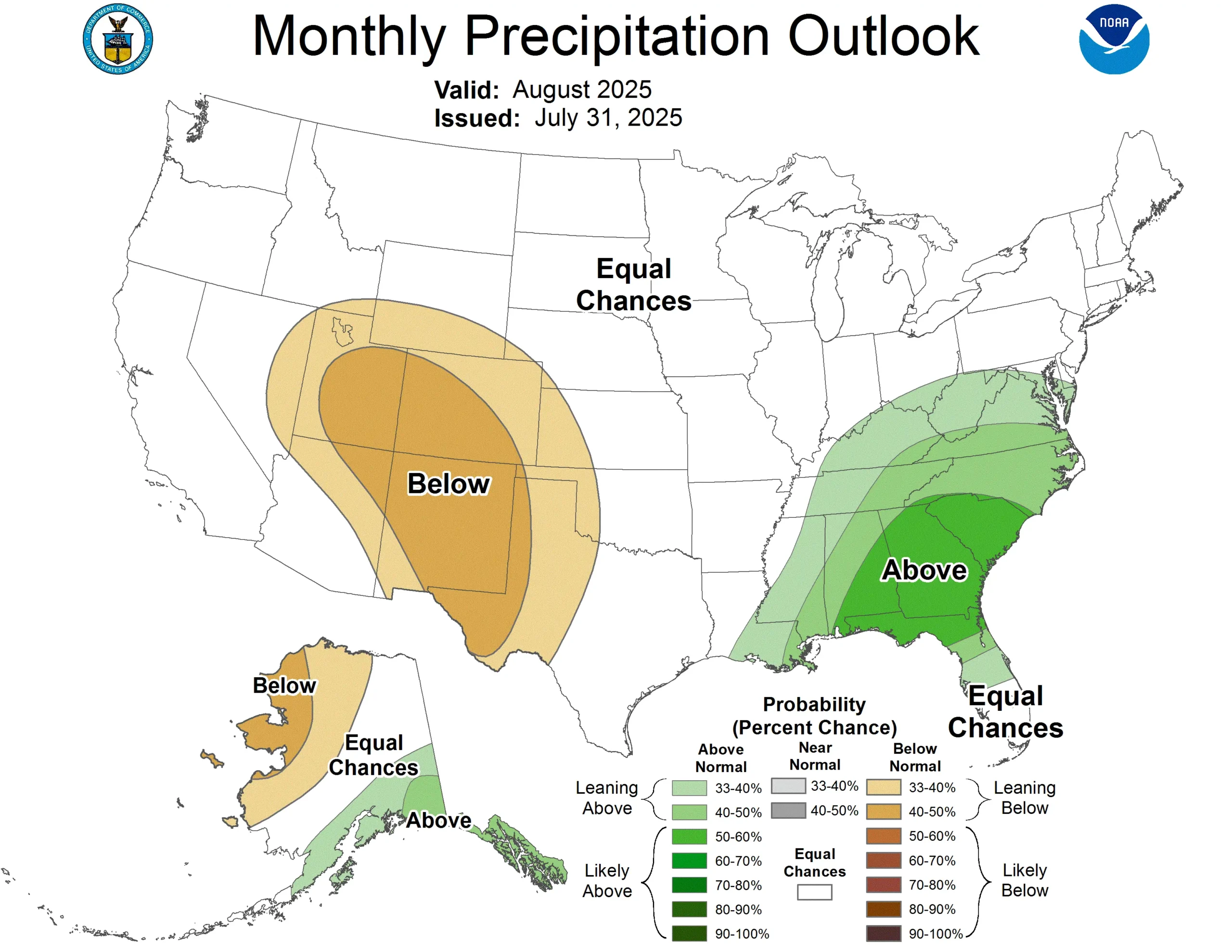 Similar to both June and July, the Climate Prediction Center sees no strong signal for exceptionally wet or dry conditions in Wisconsin, giving us equal chances of being above, below, or near average.
