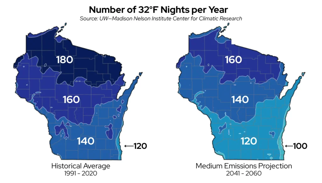 Warmer winters, especially, would reduce the total number of chill hours and disrupt the trees’ growing cycle. Projections from the Center for Climatic Research at UW—Madison show that all areas of the state could see 20 fewer freezing nights per year in the coming years.