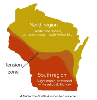 The variety and brilliance of Wisconsin’s fall colors are affected by the state’s two ecological regions, which have distinct vegetation types. These two regions are separated by a pronounced tension zone running diagonally from northwest Wisconsin near the Twin Cities toward the Milwaukee metro (Figure 3).