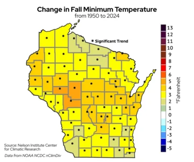 Warm nights during the fall can also mute or delay colors, as leaves stay on the trees longer. Wisconsin has experienced warming fall nights over the last 74 years, potentially causing shifts in the onset of fall colors (Figure 1).