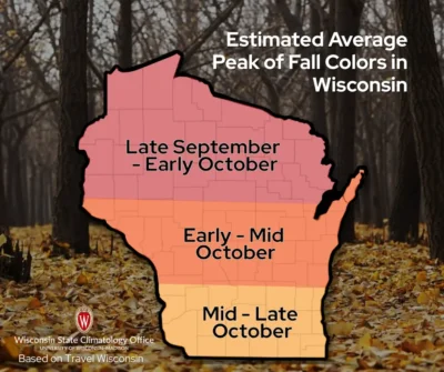 For local updates, the Wisconsin Department of Tourism maintains the Wisconsin Fall Color Report that provides weekly updates on color percentages and forecast peak dates at the county level.