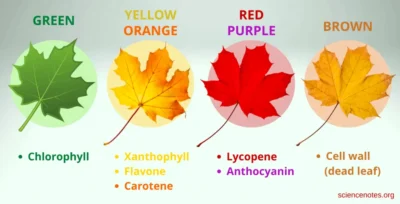 Pigments called carotenoids create yellow, orange, and brown colors, while anthocyanin pigments create shades of red, purple, and blue.