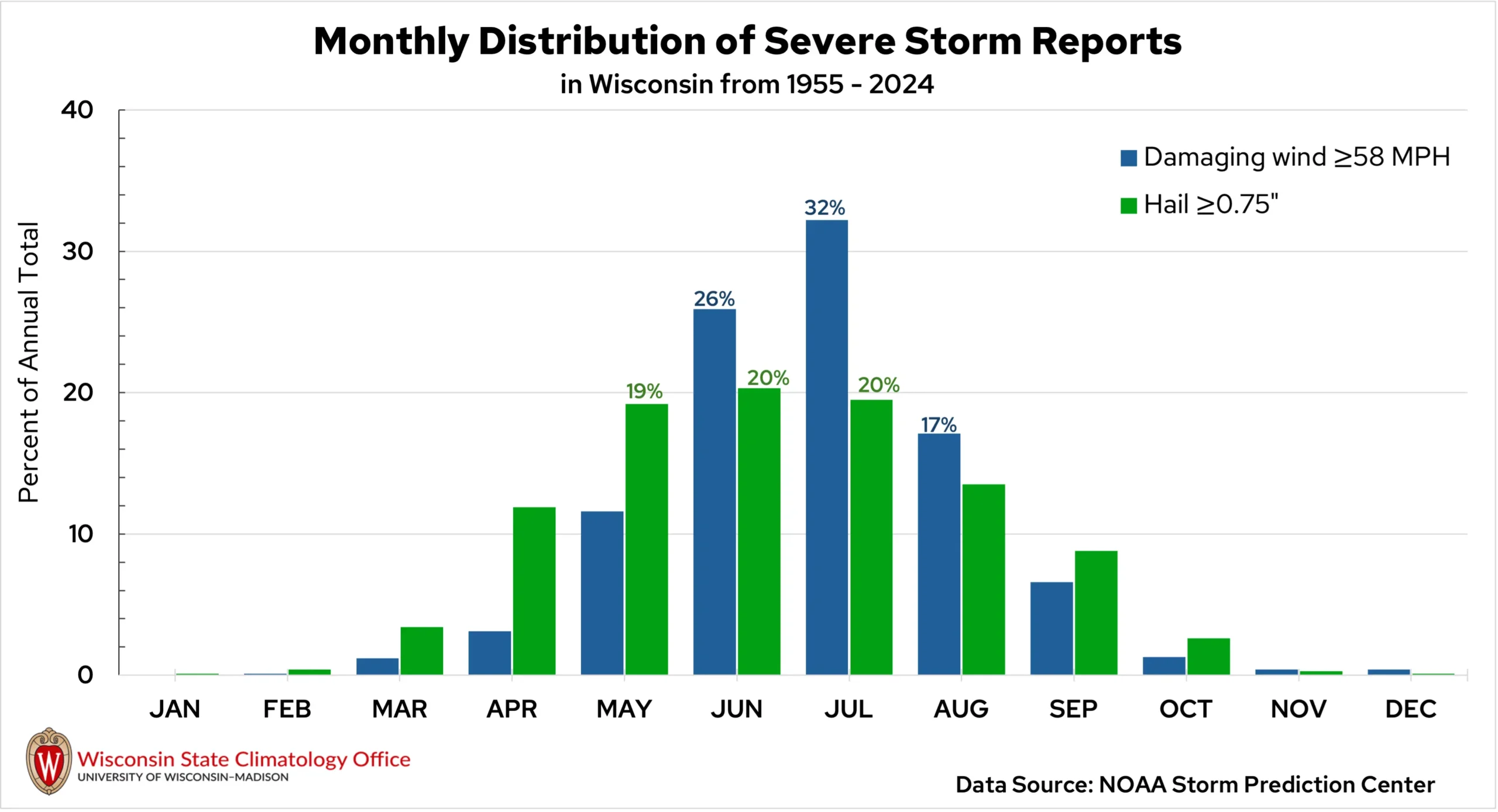 Hail-producing thunderstorms develop most frequently between May and July. Hail is often the dominant threat from spring and fall thunderstorms due to the favorably cooler air in those seasons that aids in hailstone formation. This is also why hail is more common in northern Wisconsin compared to the southern regions.