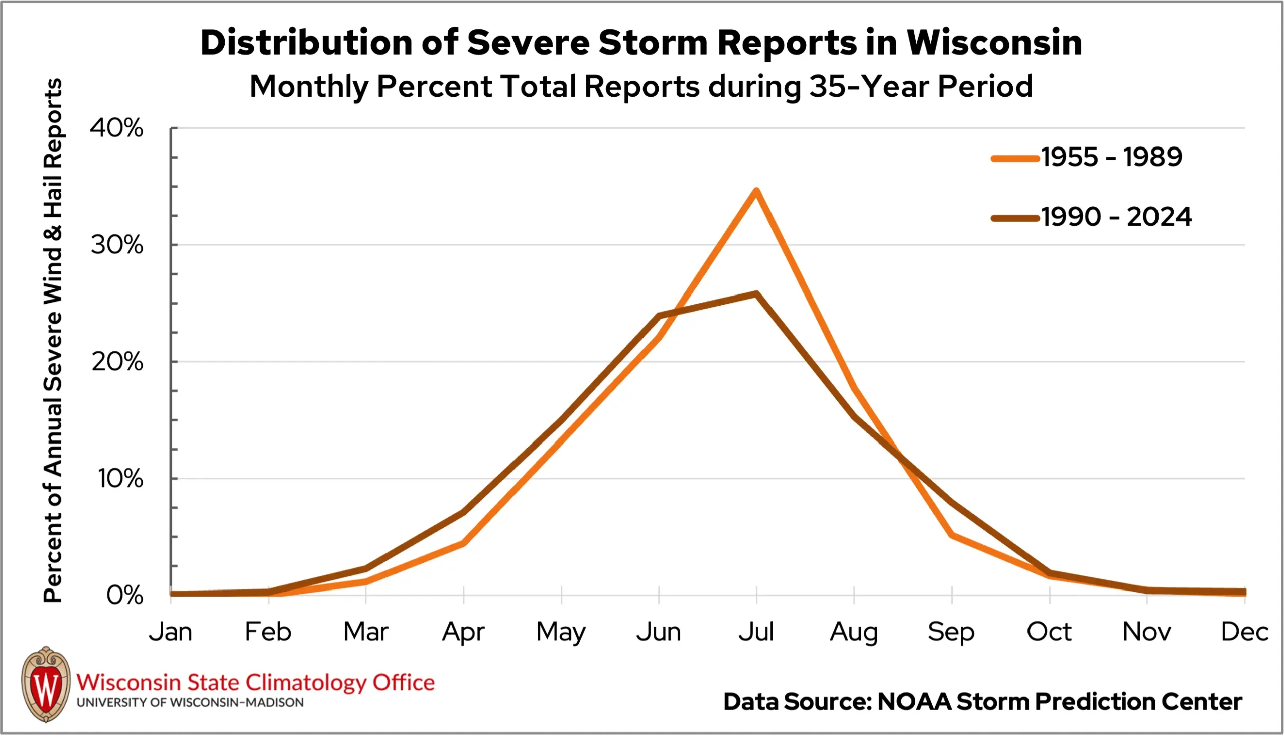 Comparing the distribution of severe weather reports by month from 1955 to 1989 and that of 1990 to 2024, a shift is evident. In earlier decades, the severe weather season had a clear peak in July. In more recent decades, that peak has flattened, spreading severe weather activity more evenly through May, June, and July. Storm activity has also increased in March, April, and September.