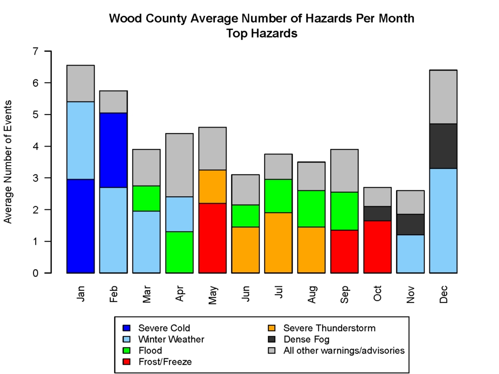 Wood County deals with an array of hazardous weather throughout the year, and the type of hazards vary from season to season. The bar chart and table above are summaries of warnings and advisories issued by the National Weather Service for Wood County over the past 20 years (2005-2024). Looking at hazards by month/season, the winter months are characterized by severe cold, snow events, and dense fog. Severe thunderstorms and flooding are more common in the late spring into summer when thunderstorms and heavy rain are more common. Frost advisories and freeze warnings are most common in May, September, and October as these are the times of year when we are transitioning into or out of the growing season and plants are susceptible to frost. Overall, the most common hazards in a year in Wood County are winter weather, severe thunderstorms, severe cold, and floods. Tornadoes are more uncommon, with one tornado warning issued per every two years for the county, on average.