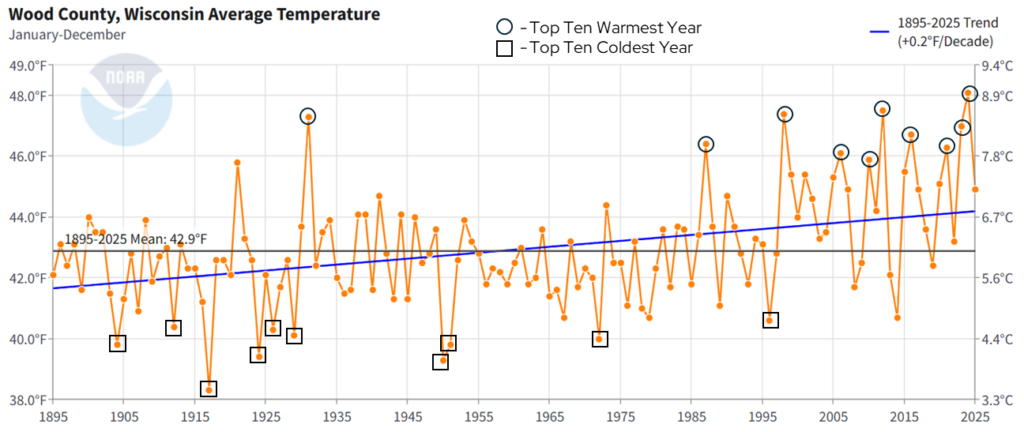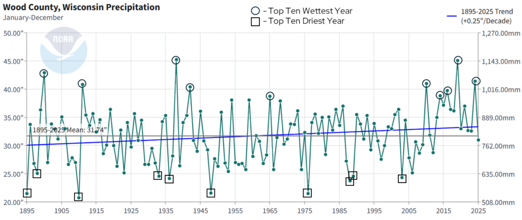 Annual precipitation shows a lot of year-to-year variability, which is normal within a long-term trend. However, there are two notable trends that come from this dataset. First, precipitation is increasing at a rate of 0.25 inches per decade from 1895 to 2025. That’s an increase of one inch approximately every 40 years. Second, if we look at the top ten wettest years since 1895 (black circles), five have occurred within in the past 20 years. By contrast, nine of the top ten driest years (black squares) occurred prior to 2000. These trends are quite similar to what has been observed in Wood County with temperatures since 1895.