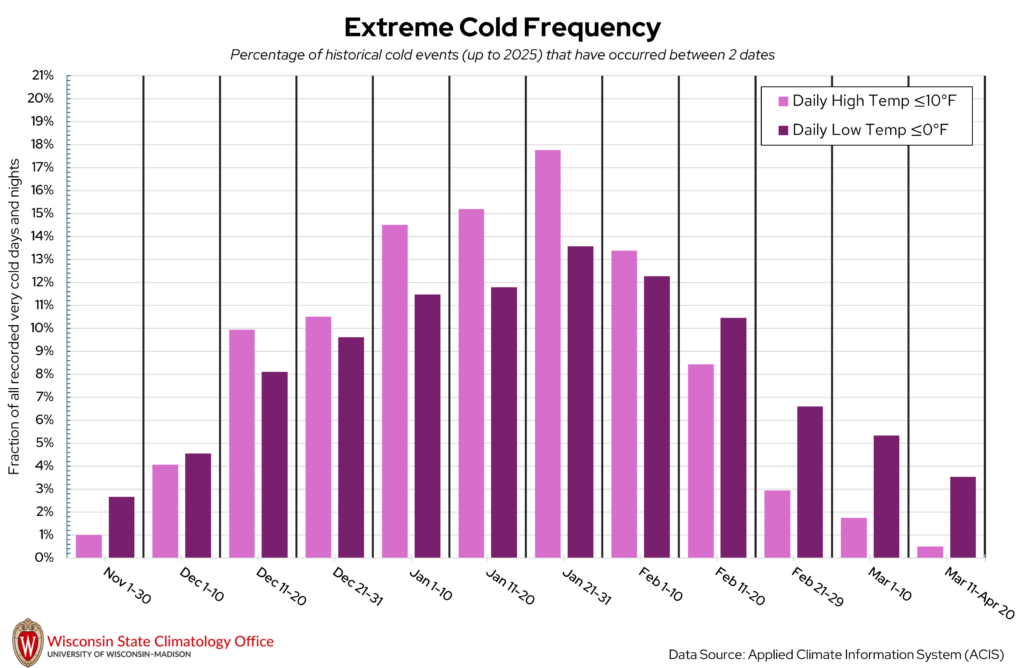 Wood County can get quite chilly once winter rolls around! Some of our coldest days of the year in Wisconsin are when the overnight low temperatures dip below 0°F. The State Climatology Office performed an analysis on the likelihood of a “very cold day” (daily high temperature ≤ 10°F) or “very cold night” (daily low temperature ≤ 0°F) occurring between two calendar dates using historical measured temperature data from NOAA stations in Wood County. Based on this analysis, very cold days and nights have occurred most frequently between January 21 to 31. Over the past 20 years (2006-2025), Wood County experienced, on average, 14 very cold days per year and 33 very cold nights per year.
