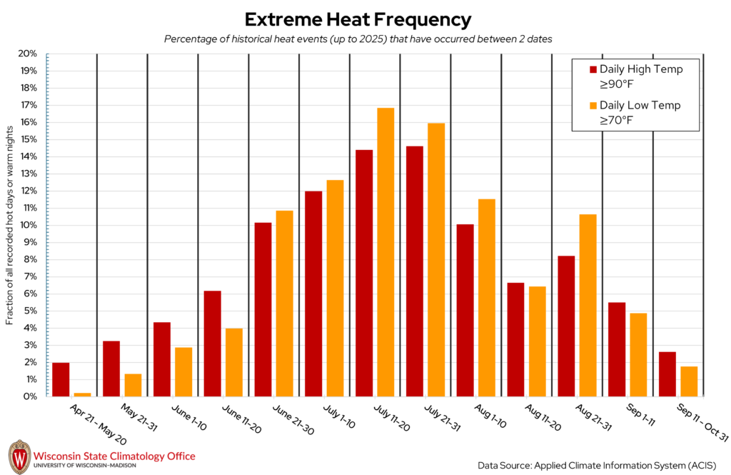 Wood County is no stranger to sweltering summer heat, where daytime temperatures can top 90°F or even 100°F. But when are these hot days most likely to occur in Wood County? The State Climatology Office analyzed the likelihood of a “hot day” (daily high temperature ≥ 90°F) or “warm night” (daily low temperature ≥ 70°F) occurring between two calendar dates using historical measured temperature data from NOAA stations in Wood County. Based on this analysis, hot days have occurred most frequently between July 11 to 31. Warm nights have been most common from July 11 to 20. Over the past 20 years (2006-2025), Wood County experienced, on average, 13 hot days per year and five warm nights per year.