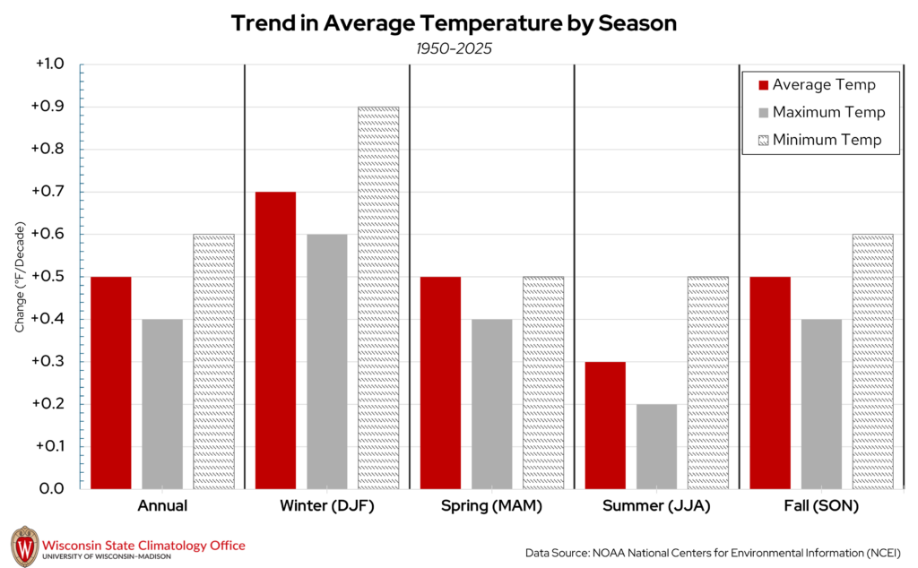 Temperatures have been increasing since 1950 in Wood County on the annual and seasonal time scales, which is the case for most of Wisconsin. Since 1950, annual average temperatures in Wood County have increased at a rate of 0.5°F/decade, which translates to an increase of 1°F every 20 years. This increase in temperature has been most pronounced in the winter months and less pronounced in the summer months. When average temperatures are split into daily high and low temperatures, low temperatures have been warming at a faster rate compared to high temperatures.